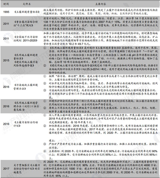 隨著土壤污染事件頻發,土壤污染防治政策出臺頻率加快。我國土壤污染防治方面的法律法規建設起步較早,但是并未得到足夠額重視,發展和完善進度緩慢,但是近期環境污染問題突出,“毒地”事件頻發引發社會關注,國家相繼出臺了相關防治政策。其中,“土十條”是當前和今后一段時間內全國土壤污染防治行動的綱領性文件。