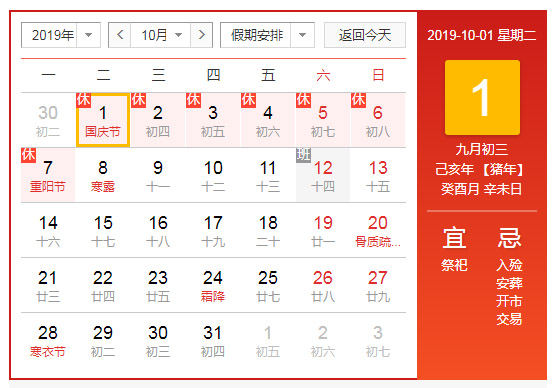 2019 年 10 月1 日(星期二)至 2019 年 10 月 7 日(星期一)放假,共 7 天; 9月29日(星期天)和10月12日(星期六)上班,10月8日(星期二)開始正常上班。