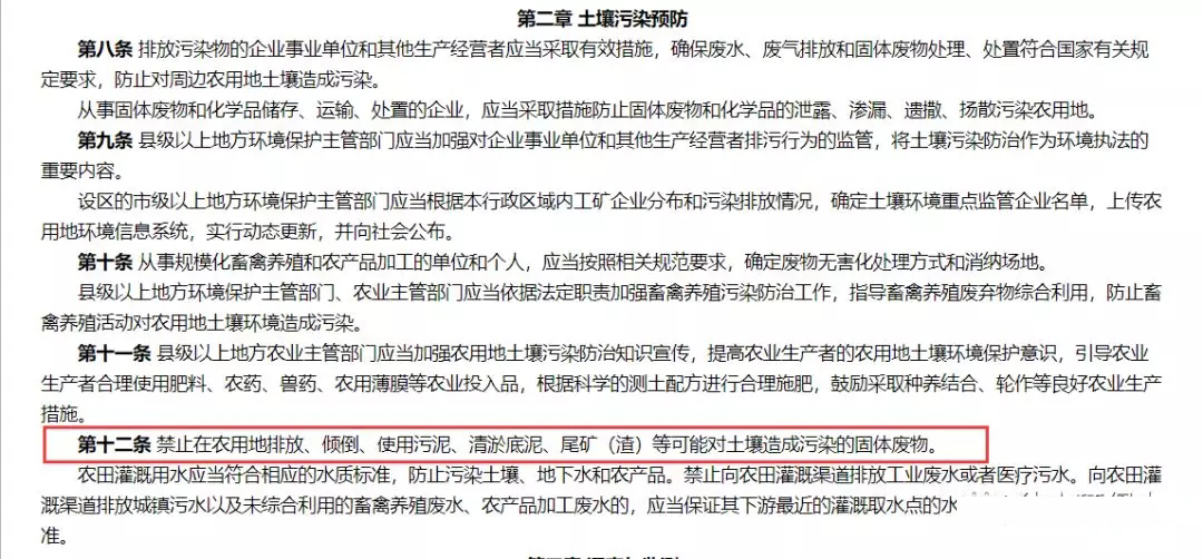 在該標(biāo)準(zhǔn)發(fā)布之前,環(huán)保部和農(nóng)業(yè)部于2017年9月25日聯(lián)合發(fā)布了《農(nóng)用地土壤環(huán)境管理辦法(試行)》(環(huán)境保護(hù)部、農(nóng)業(yè)部令 第46號(hào)),自2017年11月1日起施行。該辦法第二條第三款規(guī)定:“本辦法所稱的農(nóng)用地土壤環(huán)境質(zhì)量類別劃分和分類管理,主要適用于耕地。園地、草地、林地可參照本辦法。”同時(shí),該辦法第十二條第一款規(guī)定:“禁止在農(nóng)用地排放、傾倒、使用污泥、清淤底泥、尾礦(渣)等可能對(duì)土壤造成污染的固體廢物。"看到這里小伙伴們是不是有點(diǎn)蒙了,一個(gè)是強(qiáng)制性國(guó)家標(biāo)準(zhǔn),一個(gè)是部門規(guī)章,一個(gè)說只要滿足要求就可以用,另一個(gè)卻說禁止用。