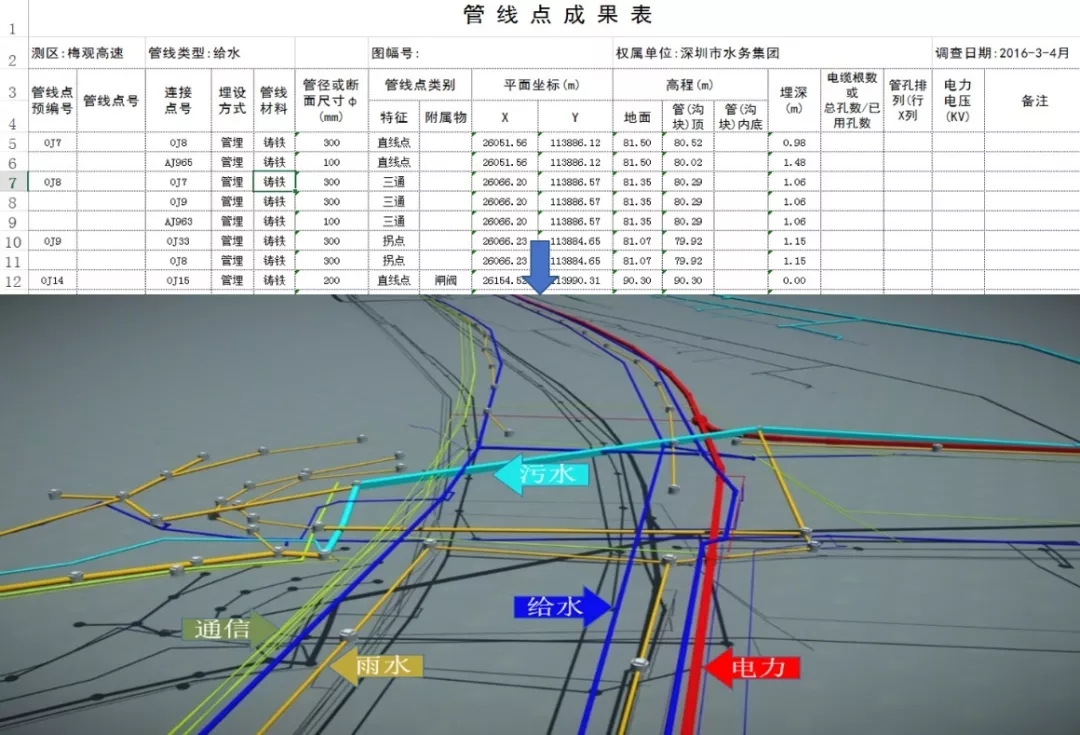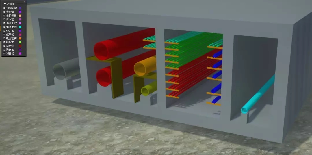 重建管網(wǎng)現(xiàn)狀模型。項目區(qū)域地下管網(wǎng)錯綜復(fù)雜,為探明復(fù)雜的管網(wǎng)現(xiàn)狀,避免設(shè)計延誤。項目組研發(fā)管網(wǎng)建模工具,重構(gòu)了完整的地下管網(wǎng)BIM模型,準(zhǔn)確定位,便于管廊設(shè)計與遷移。