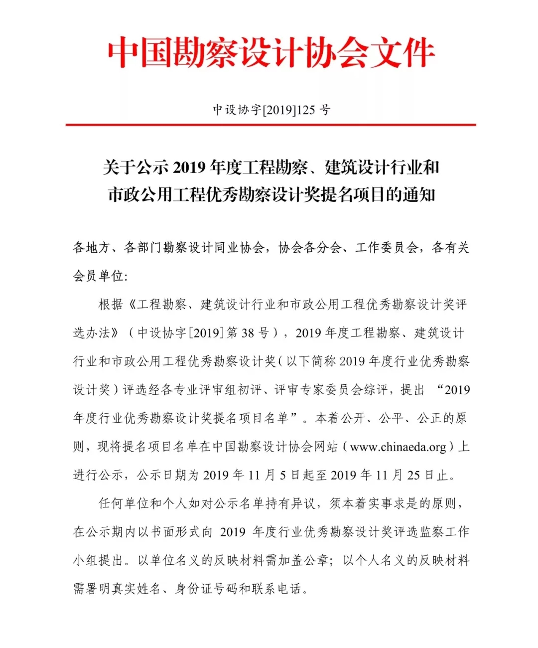 2019年度行業(yè)優(yōu)秀勘察設(shè)計獎提名項目公布!