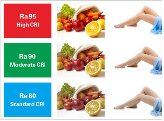 是指物體被光源發(fā)出的光照明時(shí)色彩被還原的真實(shí)程度。白熾燈的顯色指數(shù)為100,也就是說它對于色彩的還原性可以做到100%。現(xiàn)在市面上對于LED光源的應(yīng)用越來越普及,住宅照明產(chǎn)品光源的顯色指數(shù)都應(yīng)該要大于80,優(yōu)質(zhì)LED光源的顯色指數(shù)能達(dá)到90以上甚至95,但是有一大部分的劣質(zhì)產(chǎn)品其光源的顯色指數(shù)都不到70,所以用戶在選擇的時(shí)候一定要引起注意。下面關(guān)于顯色指數(shù)的對比圖可以有一個相對直觀的感受: