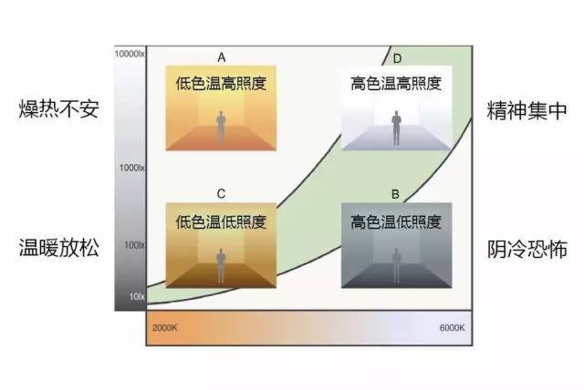 人對色溫的喜好還與照度水平有相應(yīng)的關(guān)系,不同的色溫及照度組合,會通過人的視覺令人產(chǎn)生不同的精神狀態(tài)及心理感受,所以色溫及照度組合的正確選擇是決定整個環(huán)境舒適度的基礎(chǔ)。下圖給出了不同照度水平下不 同色溫所產(chǎn)生的不同印象: