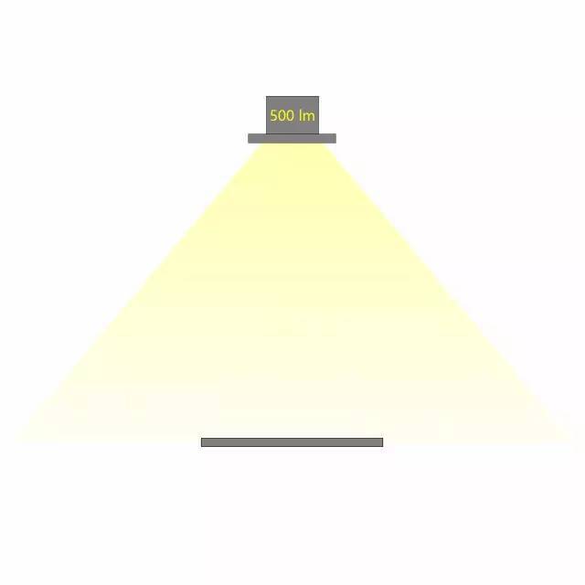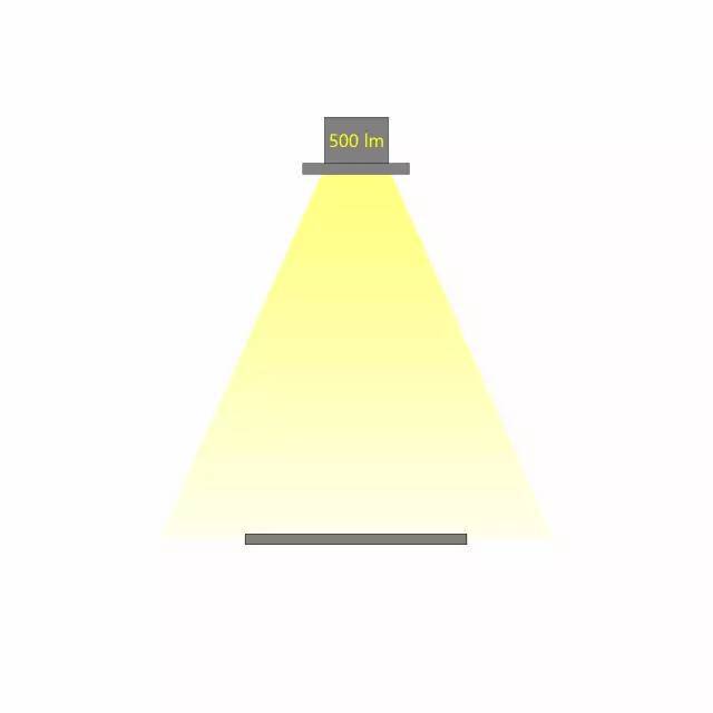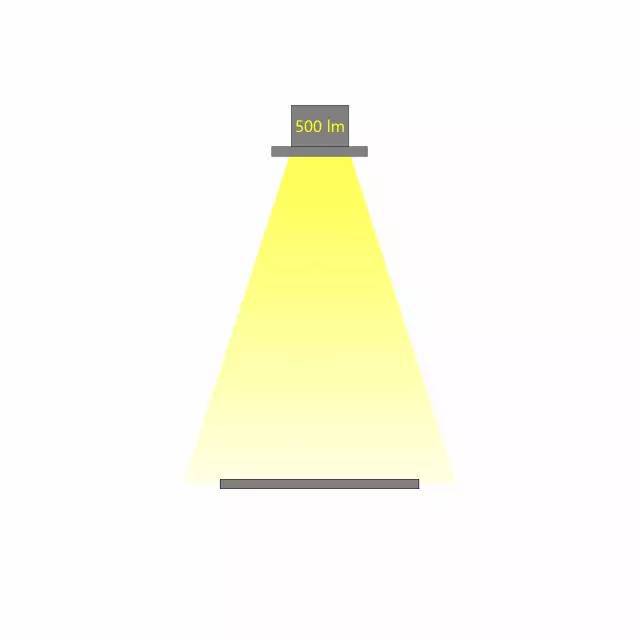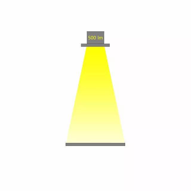 相同光通量的燈具,不同的配光角度,在相同的距離照射到同一個平面,所產(chǎn)生的照度是不同的。配光角度越大,相同距離的照度越小。如下圖,燈具的光通量為500lx,當(dāng)配光角度不同時(shí),相應(yīng)的照度也會不同。