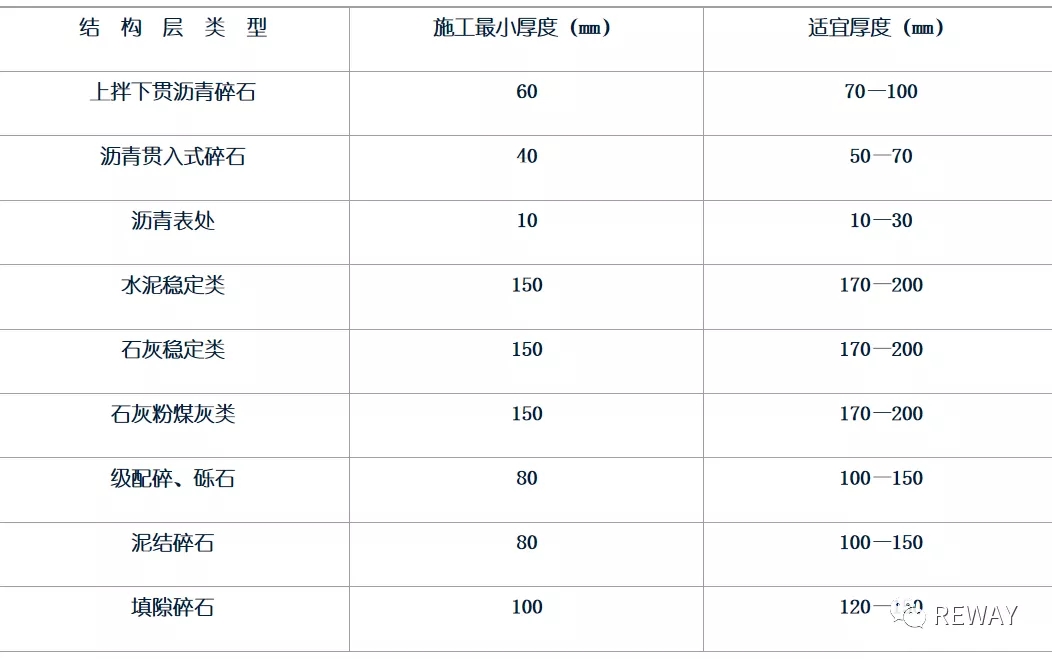 (1)當采用半剛性基層瀝青路面時,高速公路、一級公路的瀝青層厚度宜為120~160mm,二級公路的瀝青層厚度宜為70~120mm,三級公路的瀝青層厚度宜為20~50mm,四級公路的瀝青層厚度宜為10~30mm。