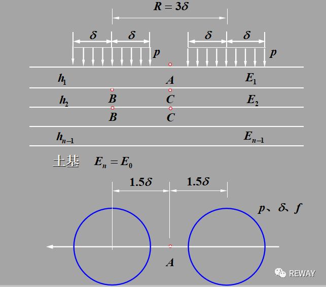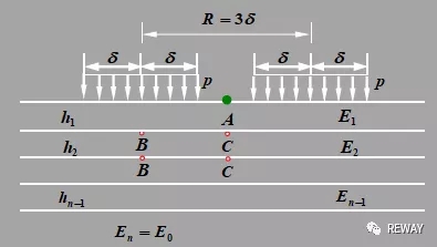層底拉應力以單圓中心 (B點)及雙圓輪隙中心 (C點)為計算點,并取較大值作為層底拉應力。按式(8.0.13)計算層底最大拉應力: