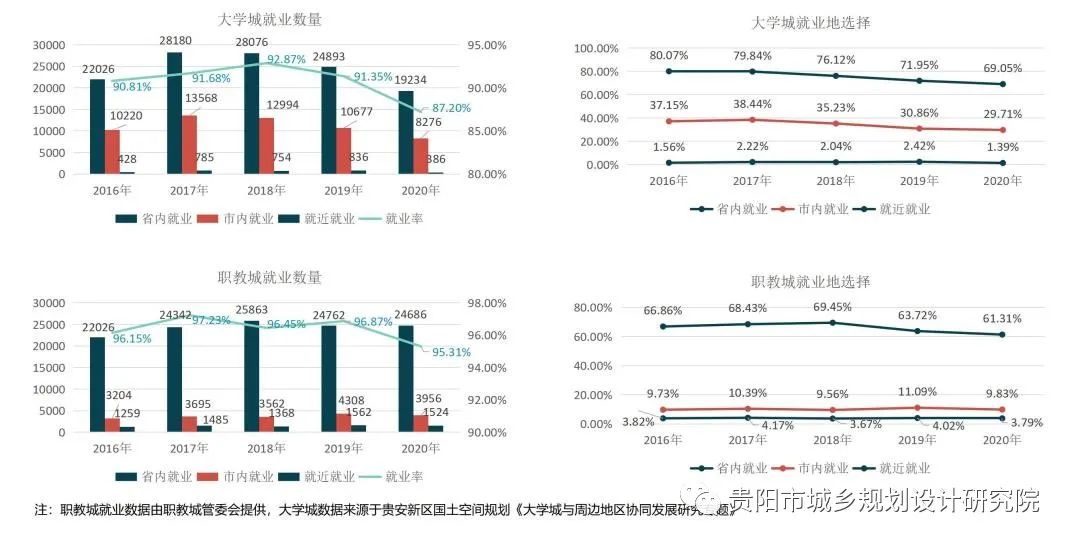 通過數據分析“兩城”在省內、市內及融合片區就近就業率,發現大學城畢業生近5年就業率穩定在90%上下,省內及市內就業的比例逐年下降,就近就業率均不足3%。職教城畢業生近5年就業率穩定在95%以上,省內就業率在60%-70%,市內就業率在10%左右,就近就業率均不足5%。