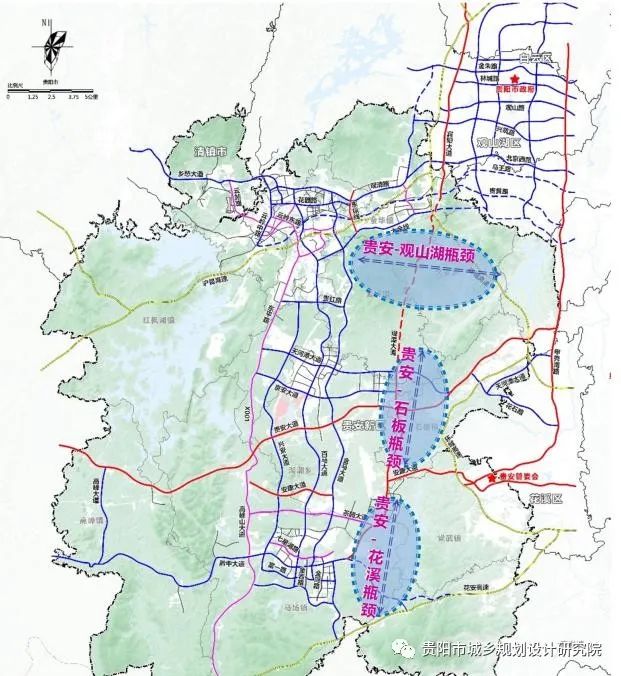 規劃區內匯集3條高速公路、2條快速路、7條主干道,骨架道路基本建成,但版塊之間銜接不足,形成貴安—觀山湖、貴安—石板、貴安—花溪3處交通瓶頸。
