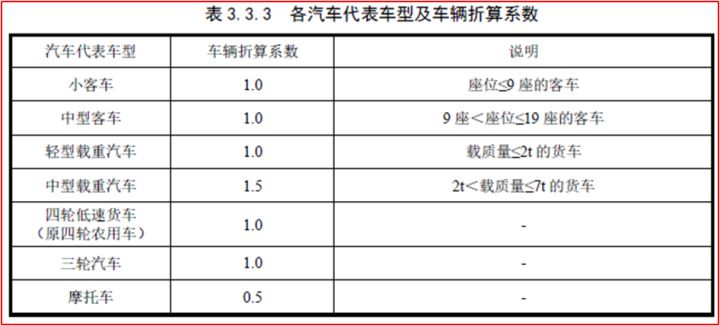 《規范》表3.3.3 各汽車代表車型及車輛折算系數