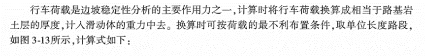 在《公路路基設(shè)計(jì)規(guī)范》(JTG D30-2015)中沒(méi)有發(fā)現(xiàn)對(duì)邊坡穩(wěn)定計(jì)算時(shí)行車(chē)荷載如何考慮的條文,但是在《路基路面工程》(黃曉明版)和《公路軟土地基路堤設(shè)計(jì)與施工技術(shù)細(xì)則》(JTG/T D31-02-2013)中有相關(guān)表述。《公路軟土地基路堤設(shè)計(jì)與施工技術(shù)細(xì)則》4.1.4-4.1.6條的規(guī)定如下,即將行車(chē)荷載換算成土柱高度,可按車(chē)輛荷載均布于車(chē)輛投影面積上換算得出。