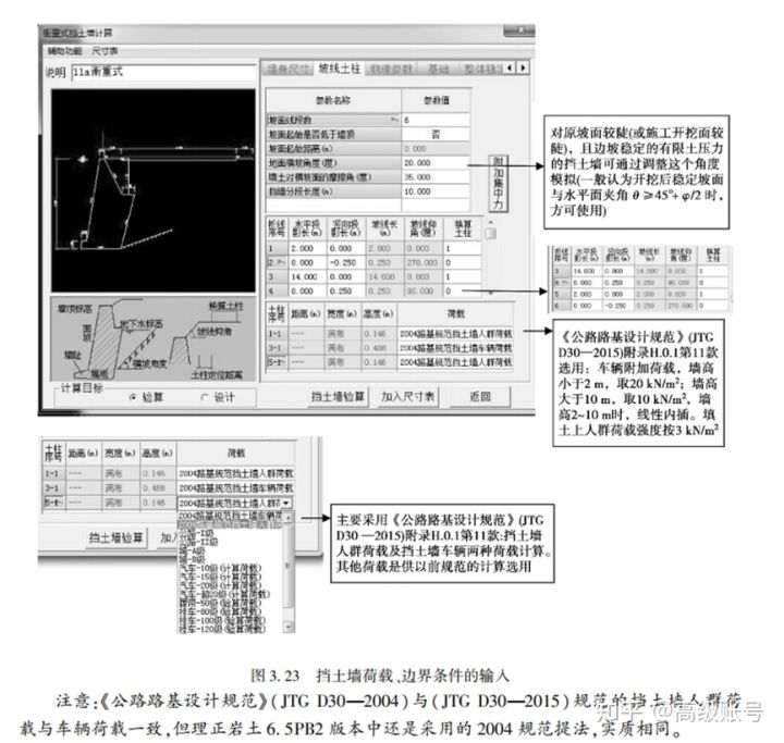 在實(shí)際設(shè)計(jì)工作中也常用理正軟件來(lái)進(jìn)行設(shè)計(jì)或驗(yàn)算。理正擋墻中內(nèi)置了多種計(jì)算車(chē)輛荷載的方法,其中采用“2004路基規(guī)范擋土墻車(chē)輛車(chē)載”這一選擇,即是跟現(xiàn)行規(guī)范的規(guī)定一致,換算土柱高度是根據(jù)我們輸入的墻高和填土容重自動(dòng)計(jì)算的。所以個(gè)人認(rèn)為直接選這一項(xiàng)就可以了。