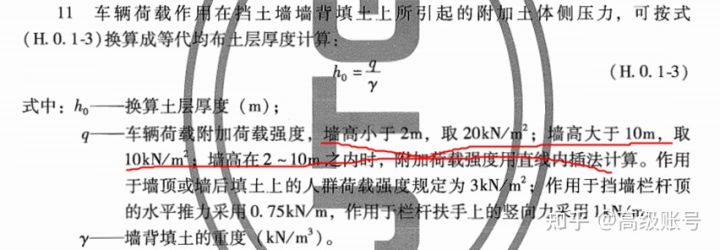 對(duì)于擋土墻的結(jié)構(gòu)設(shè)計(jì)和驗(yàn)算,在《公路路基設(shè)計(jì)規(guī)范》(JTG D30-2015)的附錄H里對(duì)行車(chē)荷載如何考慮是有規(guī)定的,H.0.1的11條,核心思路也是將車(chē)輛荷載換算為對(duì)應(yīng)土柱高度,但是相較穩(wěn)定計(jì)算則考慮的更為簡(jiǎn)單,它的車(chē)輛荷載附加荷載強(qiáng)度值是給定的,10~20kPa,按照規(guī)定取就行了。