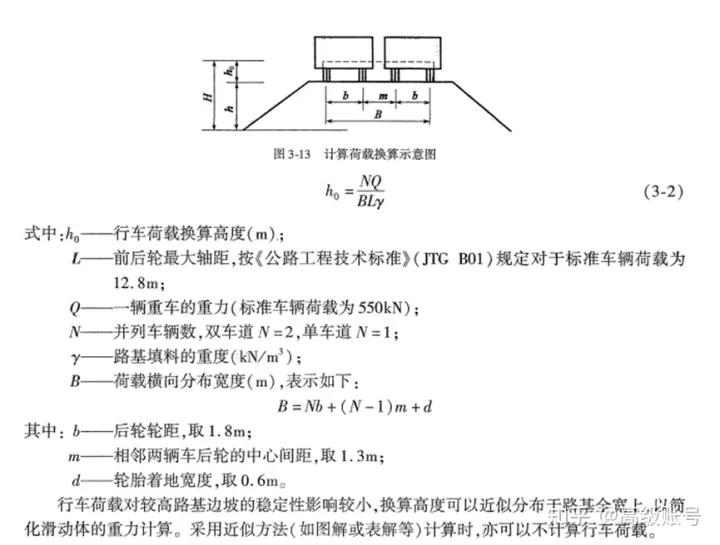在《公路路基設計規范》(JTG D30-2015)中沒有發現對邊坡穩定計算時行車荷載如何考慮的條文,但是在《路基路面工程》(黃曉明版)和《公路軟土地基路堤設計與施工技術細則》(JTG/T D31-02-2013)中有相關表述?!豆奋浲恋鼗返淘O計與施工技術細則》4.1.4-4.1.6條的規定如下,即將行車荷載換算成土柱高度,可按車輛荷載均布于車輛投影面積上換算得出。