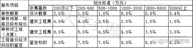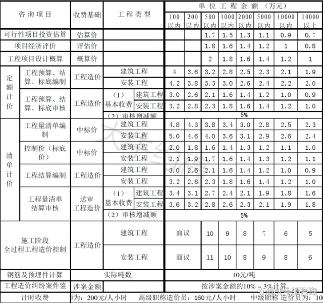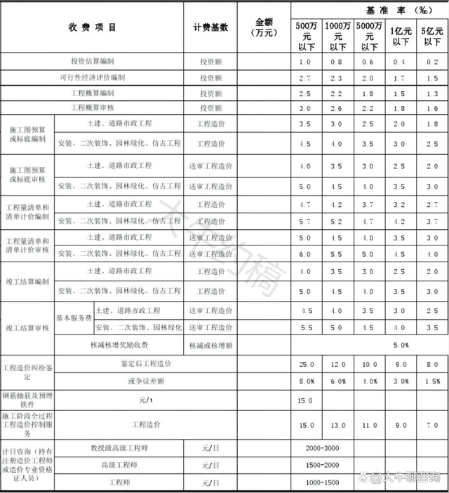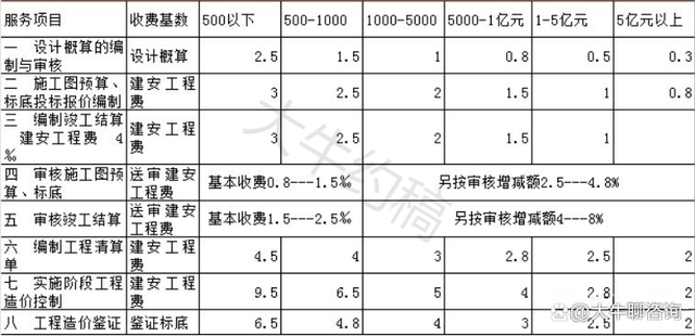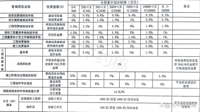 1、表中“工程預算、結(jié)算、標底審核”和“工程量清單結(jié)算審核”項目的計費方式為(1)+(2)。其中審增額向施工單位收取咨詢費,審減額向建設單位收取咨詢費。凡工程審減率超過10%的,其超過部分咨詢費用 施工單位承擔,無審核增減額的,按基本收費收取。咨詢服務費一律由委托單位支付;