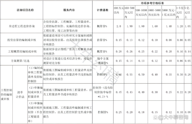 1.工程造價咨詢服務收費根據(jù)不同咨詢項目的性質(zhì)、內(nèi)容采取差額定率分檔累進方法計算;