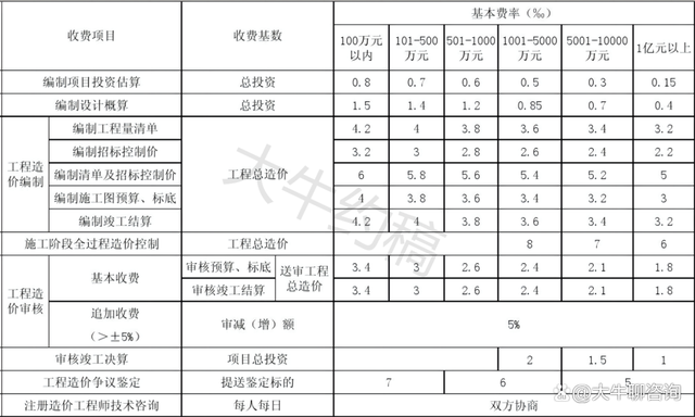 2、表中“控制價(標底價)、工程結(jié)算審核”“工程預算、結(jié)算、標底審核”項目的計費方式為⑴+⑵;