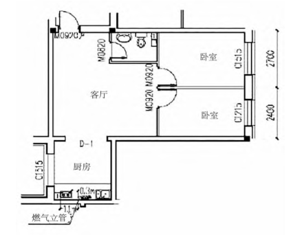 在室內(nèi)鋪設(shè)燃?xì)夤芫€時(shí),必須注意:①不能鋪設(shè)在潮濕或含有腐蝕性介質(zhì)的房間,也不能將其引入臥室,特別是在臥室、浴室或衛(wèi)生間里;②嚴(yán)禁通過易燃、爆炸物品、配電間、變電所、煙、風(fēng)道等場(chǎng)所;③橫穿臥房、衛(wèi)生間或地下室的管道,應(yīng)在套管內(nèi)安裝焊接;④如需放置于潮濕或有腐蝕性介質(zhì)的室內(nèi),則應(yīng)采用防腐蝕措施;⑤管道穿越樓板、樓梯平臺(tái)、墻壁、隔墻時(shí),應(yīng)將管線置于套管內(nèi)。⑥安裝燃?xì)庠畹姆块g凈高不宜低于2.2米,安裝熱水器的房間應(yīng)該宜大于2.4米。如圖3所示,室內(nèi)廚房豎管的設(shè)計(jì)。