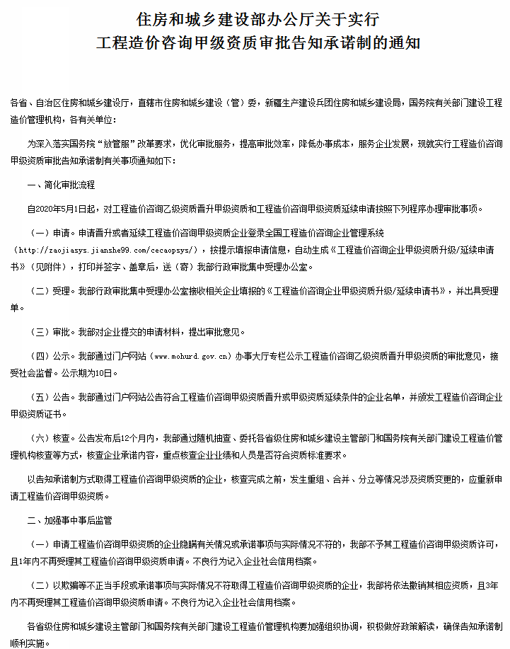 今年四月三十號,就在不久前,住建廳又發布了廳關于實行工程造價咨詢甲級資質審批告知承諾制的通知,重點是簡化審批流程,和加強事中監管。