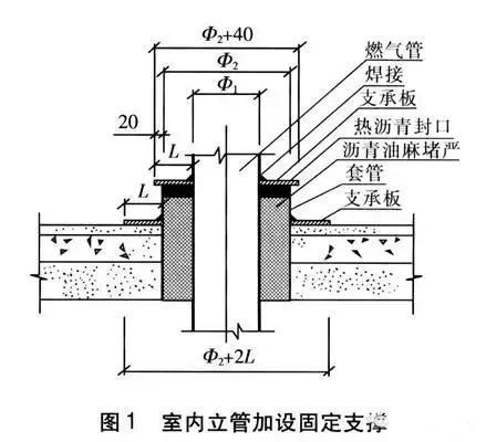 ① 對于室內(nèi)立管,在每隔7~10層的穿樓板處加設(shè)固定支撐,使燃氣管道、套管以及建筑物成為一體。具體做法見圖1(圖中單位為mm)。
