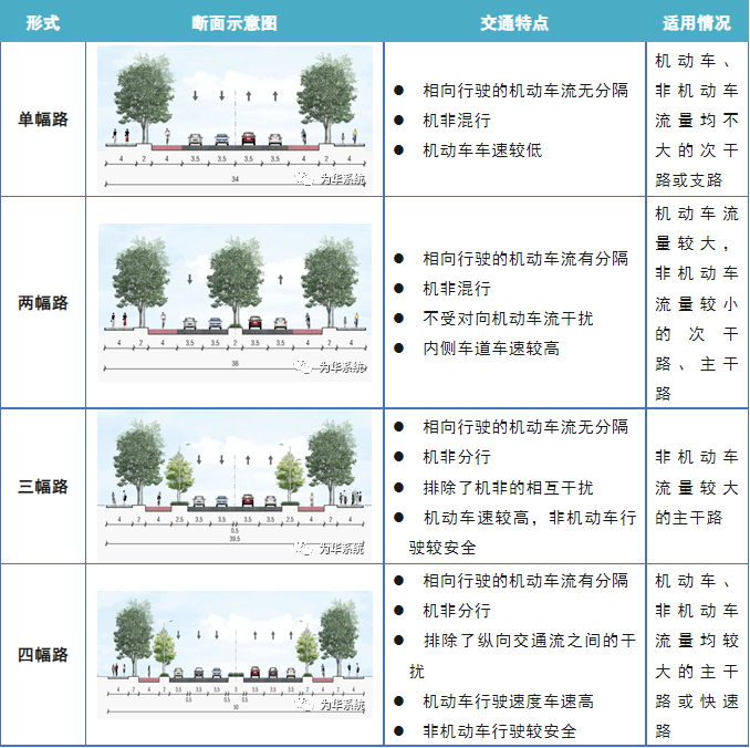 城市道路斷面組成要素通常包括:機(jī)動(dòng)車道、非機(jī)動(dòng)車道、人行道、中央分隔帶、機(jī)非分隔帶等類型。道路橫斷面一般可分為單幅路、兩幅路、三幅路、四幅路,各種斷面特點(diǎn)和適用情況如下。