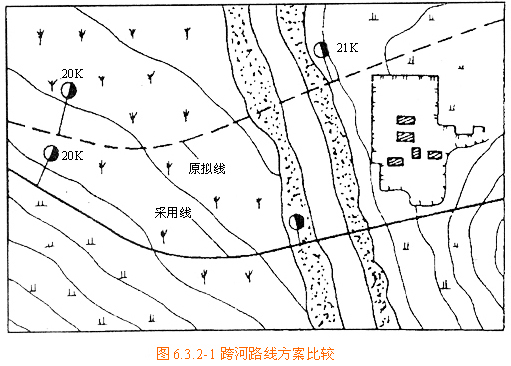 1、平原區新建公路要占用一些農田,這是不可避免的,但要盡量做到少占和不占高產田。布線要從路線對國民經濟的作用、對支農運輸的效果、地形條件、工程數量、交通運輸費用等方面全面分析比較,既不能片面求直占用大片良田,也不能片面強調不占某塊田,使路線彎彎曲曲,造成行車條件惡化。如圖6.3.2-1,公路通過某河附近時,如按虛線方案走田中間穿過,路線短,線形好,但多占好田,填筑路基取土困難;如將路線移向坡腳(實線),里程雖略有增長,但避開了大片高產田,而且沿坡腳布線,路基可為半填半挖,既節省了土方,又避免了填方借土的遠運。
