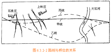 1、特大橋是路線基本走向的控制點,大橋原則上應服從路線總方向并滿足橋頭接線的要求,橋路綜合考慮。一般情況下,橋位中線應盡可能與洪水的主流流向正交,橋梁和引道最好都在直線上。位于直線上的橋梁,如兩端引道必須設置曲線時,首先應考慮橋梁及其引道的位置對線形設計的影響,要使橋梁與線形的配合視野開闊,視線誘導良好。當條件受限制時,也可設置斜橋或曲線橋。要注意防止兩種偏向:一種是單純強調橋位,造成路線過多地迂繞,或過分強調正交橋位,出現橋頭急彎影響行車安全;另一種只顧線形順直,不顧橋位,造成橋位不合適或斜交過大,增加建橋困難。如圖6.3.2-2,跨線跨河有三個方案:就橋梁而言,乙線較好,但線較長;就路線而言,甲線里程最短,但橋梁多,且都為斜交;丙線則各橋都近于正交,線形也較舒順美觀。三個方案都有可取之處,因這條路交通量甚大,且有超車需要,故采用甲線。