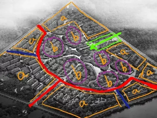強調南北主線, 通過錯開的方式獲得變化,內部加入環形路聯系四個組團中心,適合低密度產品。