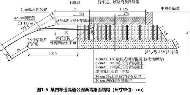 3)排水墊層。為攔截地下水、滯水或泉水進入路面結構,或排出因負溫差作用而積聚在路基上層的自由水, 可直接在路基頂面設置透水性排水墊層,并適當配置縱向集水溝、排水管或出水管等,如圖1-11所示。