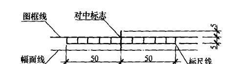 (2)需要縮微后存檔或復(fù)制的圖紙,圖框四邊均應(yīng)具有位于圖幅長邊,短邊重點(diǎn)的對中標(biāo)志(圖2-1),并應(yīng)在下圖框線的外側(cè),繪制一段長100cmm標(biāo)尺,其分隔為10mm。對中標(biāo)志的線寬宜采用大于或等于0.5mm,標(biāo)尺線的線寬宜采用0.25mm的實(shí)線繪制(圖2-2)