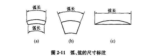 (9)圓弧尺寸宜按圖2-11(a)標(biāo)注。當(dāng)弧長分為數(shù)段標(biāo)注時(shí),尺寸界線也可沿徑向引出,見圖2-11(b)。弦長的尺寸界線應(yīng)垂直圓弧的弦,見圖2-11(c),