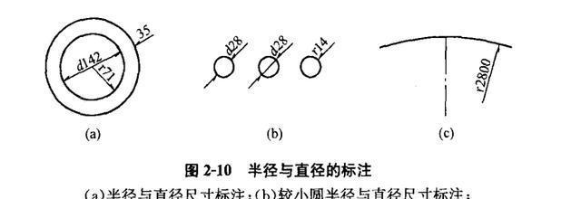 (8)半徑與直徑可按圖2-10(a)標(biāo)注。當(dāng)圓的直徑較小時(shí),半徑與直徑可按圖2-10(b)標(biāo)注;當(dāng)圓的直徑較大時(shí),半徑尺寸的起點(diǎn)可不從圓心開始,見圖2-10(c)0半徑和直徑的尺寸數(shù)字前,應(yīng)標(biāo)注“r(R)”或“d(D)",見圖2-10(b).