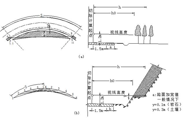 (1)道路平面上的暗彎,即處于挖方路段的彎道和內側有障礙物的彎道,見圖a