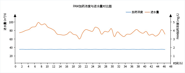 消除由于進水不穩定造成的出水 SS 波動,削峰效果明顯,使出水 SS 穩定達標,而且在進水 SS 較低時,可以自動降低藥劑投加量或者間斷性加藥,極大地節省藥劑投加量。智能加藥系統穩定可靠、精準控制,為用戶降低管理成本及提升經濟效益,具有廣闊的應用前景。
