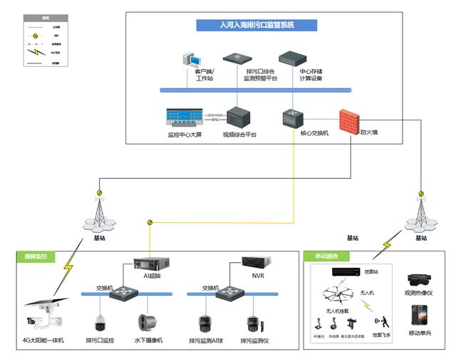 對排污口排放的受納水體采用排污監測儀進行水質在線監測。通過 4 G 太陽能攝像機、水下攝像機等設備全天候實時監測排污口排污狀況,發現違規事件及時告警。通過無人機對河道情況進行立體化巡查,并可搭載高光譜水質掛載,實現河道水質指標反演。通過 單兵 、觀測熱像儀等設備 , 進行排口移動巡查、取證記錄 。